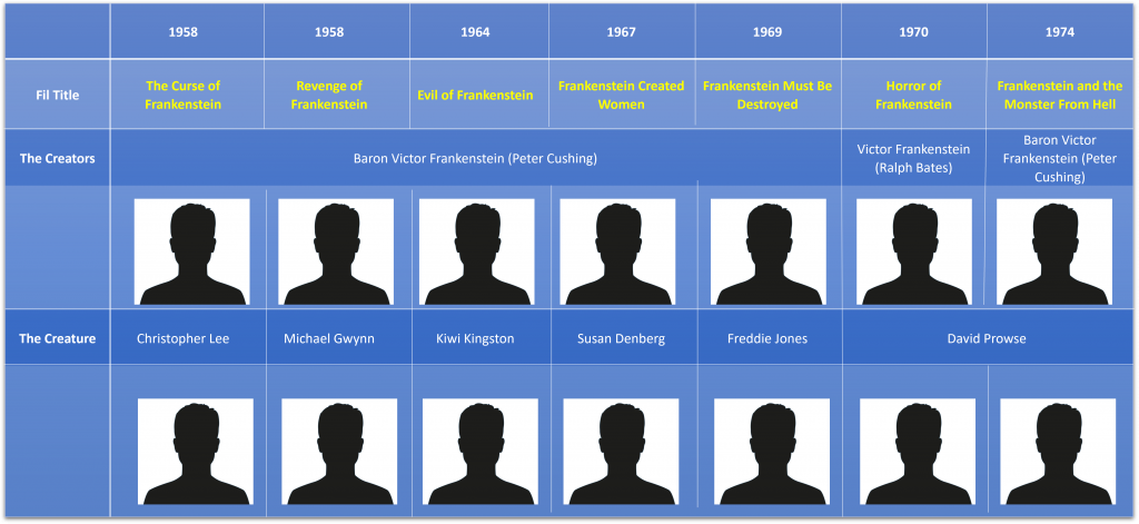 I also find it interesting to look at a comparison between films based on Frankenstein, produced by Universal Film Studios, and those produced by Hammer Films. The tables below show a summary.