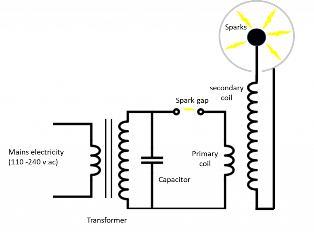 This high voltage feeds the primary coil and capacitor. The charge in the capacitor slowly builds up before eventually breaking down the air resistance in the spark gap. Then, electricity flows across the spark gap effectively short circuiting the primary circuit , discharging it, the magnetic field collapses and this induces a larger magnetic field in the secondary coil.