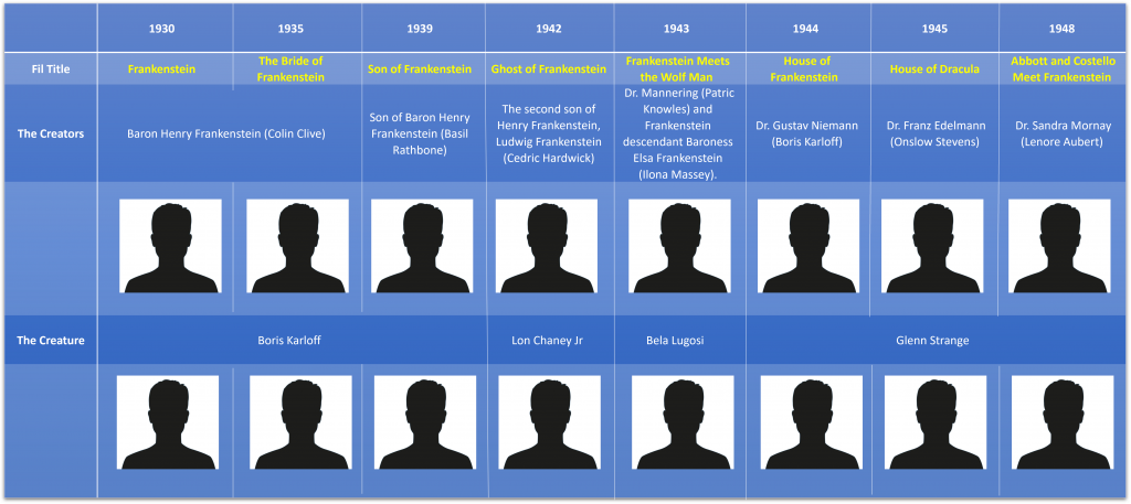 Interestingly, for Universal films, each film has mostly different scientist creating/reviving the creature, and the creature is the same character, albeit played by different actors. Hammer films on the other hand had a consistent scientist, mostly played by Peter Cushing, who created a new creature in each film.